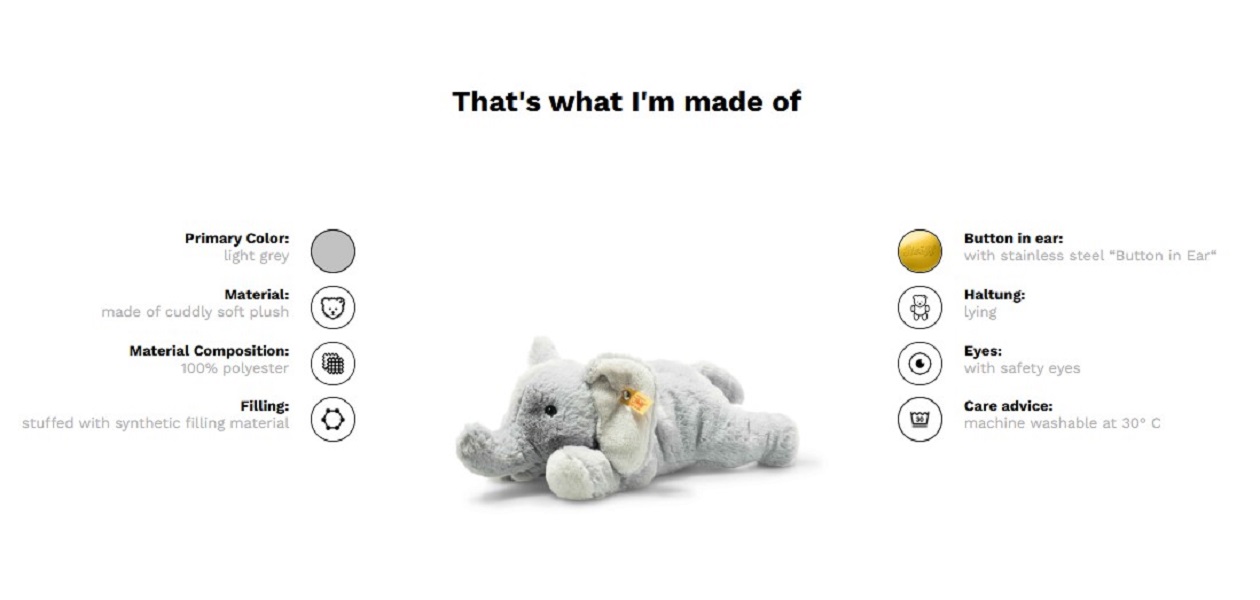 Steiff Elna Elephant – Light Grey is a premium plush elephant from the iconic German brand. Made of ultra-soft 100% polyester plush with high-quality synthetic filling, it comes with safety eyes, a stable posture, and Steiff’s stainless steel “Button in Ear”. With its light grey color and 28 cm size, this plush is perfect for cuddling, gifting, or displaying.