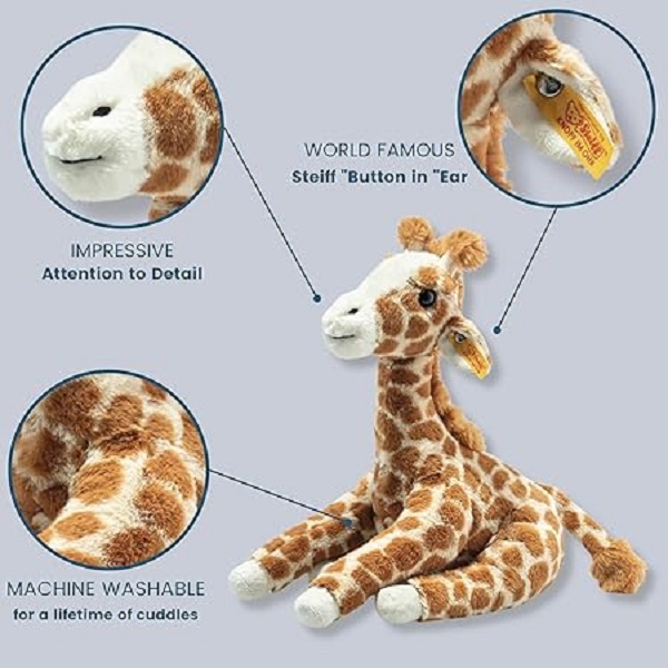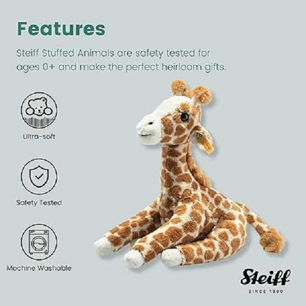 Steiff Gina Giraffe – Light Brown is a premium plush giraffe from the iconic German brand. Made of ultra-soft 100% polyester plush with high-quality synthetic filling, it comes with safety eyes, a stable posture, and Steiff’s stainless steel “Button in Ear”. With its light brown tones and 25 cm size, this plush is perfect for gifting, cuddling, or collecting.