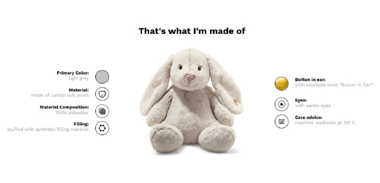 Steiff Hoppie Rabbit – Light Grey is a premium plush rabbit from the iconic German brand. Made of ultra-soft 100% polyester plush with high-quality synthetic filling, it comes with safety eyes, a stable sitting posture, and Steiff’s signature stainless steel “Button in Ear”. With its charming light grey color and 48 cm size, this plush is perfect for cuddling, gifting, or displaying as part of a collection.