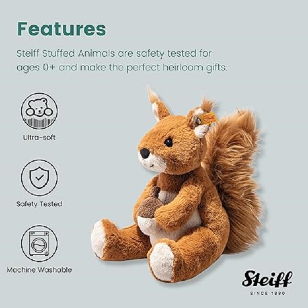 Steiff Phil Squirrel – Light Brown is a premium plush squirrel from the iconic German brand. Made of ultra-soft 100% polyester plush with high-quality synthetic filling, it comes with safety eyes, a stable posture, and Steiff’s stainless steel “Button in Ear”. With its light brown color and 20 cm size, this plush is perfect for gifting, cuddling, or collecting.