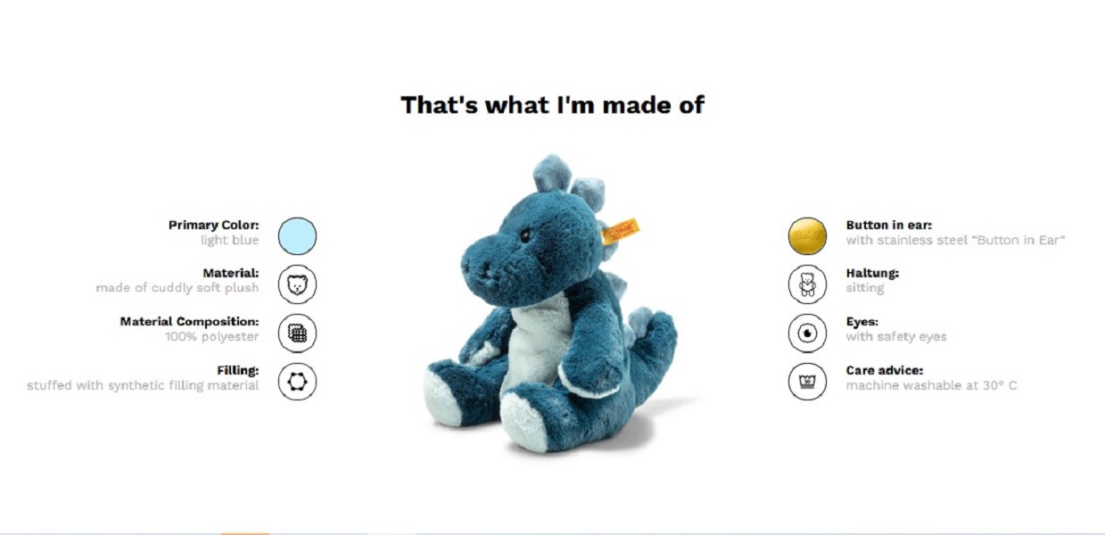Steiff Spott Stegosaurus – Medium Blue is a premium plush dinosaur from the iconic German brand. Made of ultra-soft 100% polyester plush with high-quality synthetic filling, it comes with safety eyes, a stable posture, and Steiff’s stainless steel “Button in Ear”. With its medium blue color and 28 cm size, this plush is perfect for cuddling, gifting, or displaying.